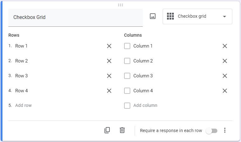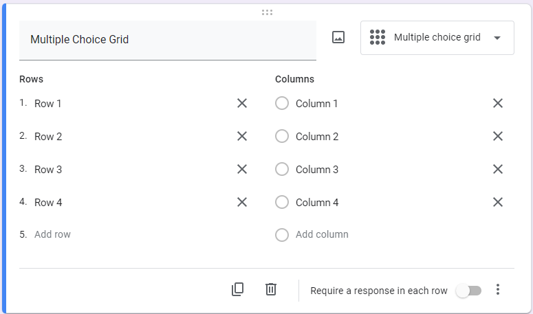 This allows you to create a group of multiple choice questions formatted as a grid, with the option to select multiple answers for each question. This makes asking numerous questions that would be answered the same way much easier.